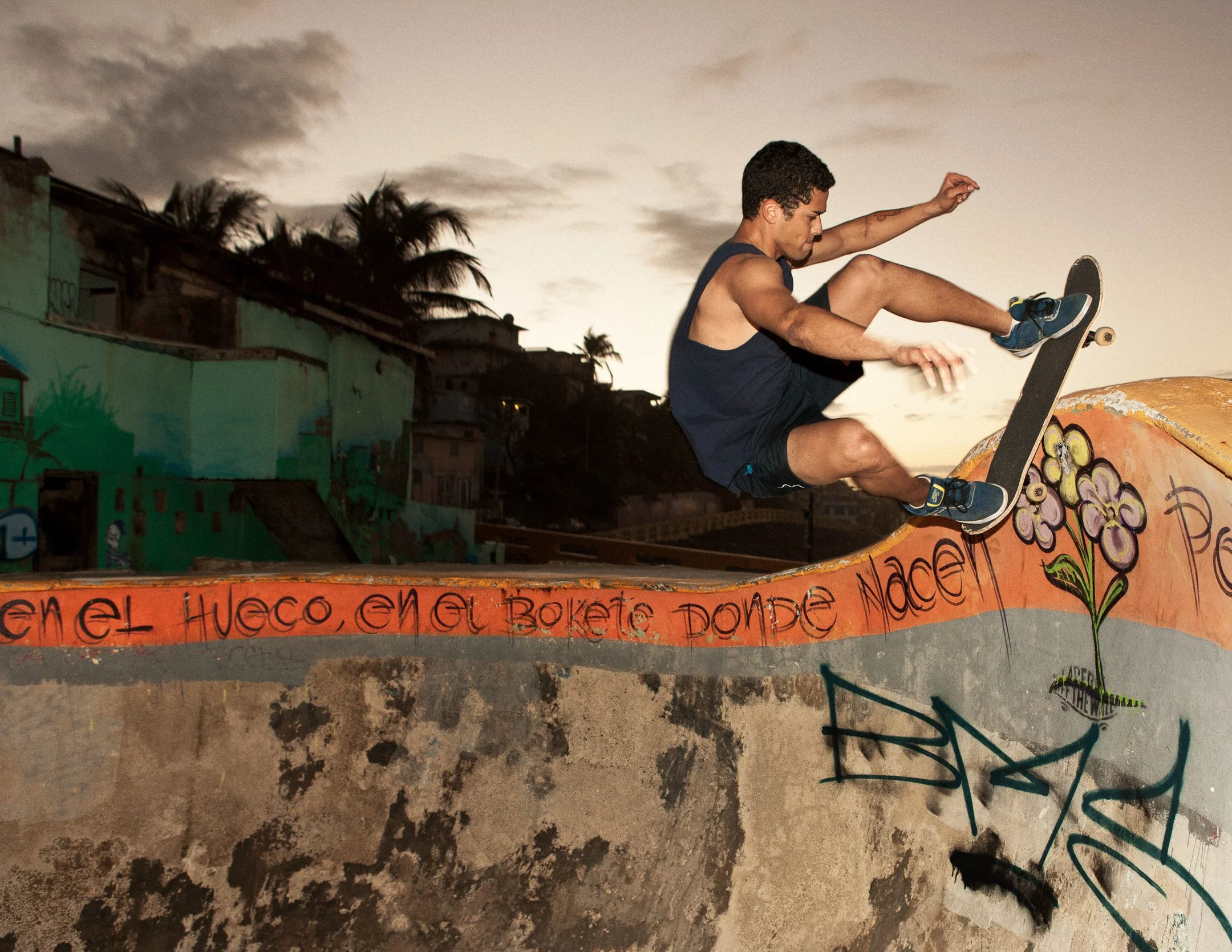 Young people with skateboards, graffiti in background, casual attire.